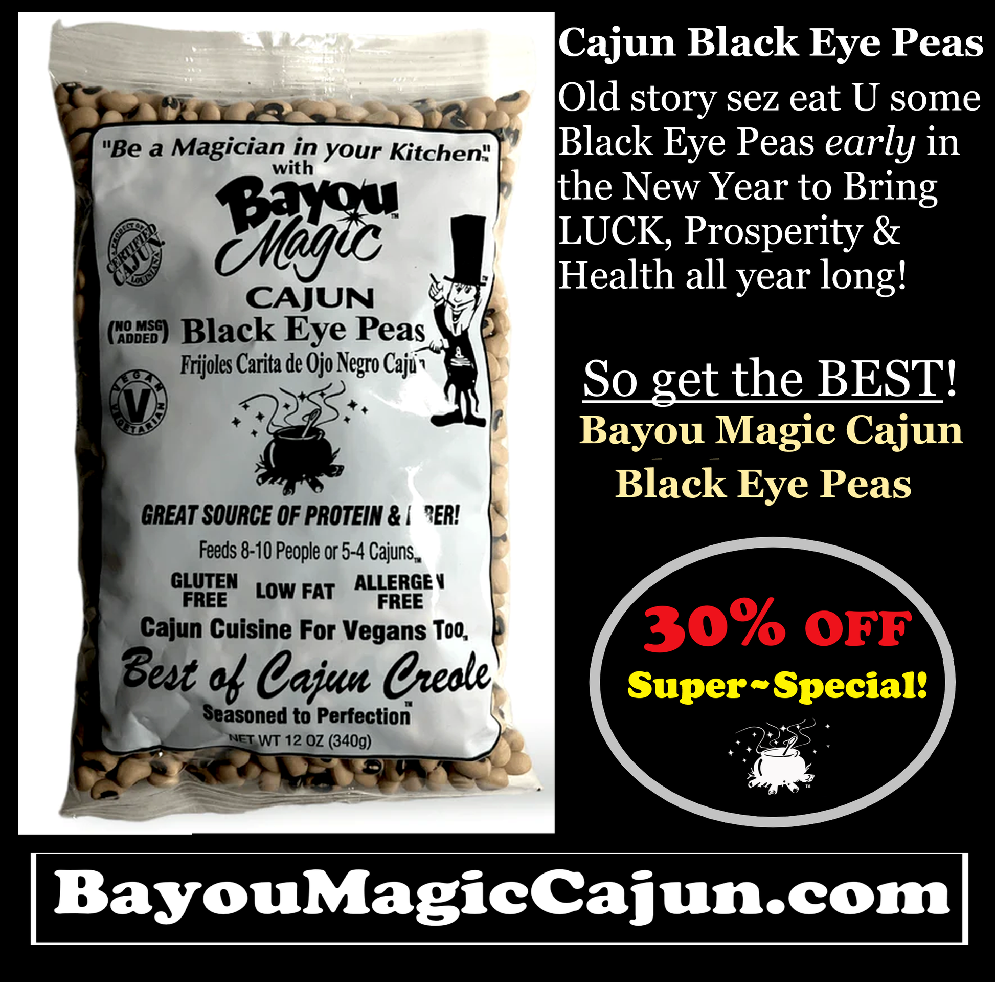 Be a Magician & Physician in your Kitchen™ with Bayou Magic Cajun Black Eye Peas. Beans are heart healthy, brain healthy, high protein & high fiber! Black Eye Peas are eaten throughout the year in Cajun country and are believed to bring luck when eaten early in the New Years!